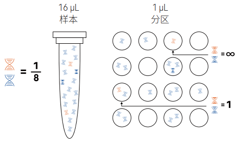 相對于潛在PCR抑制劑和干擾背景序列,分區(qū)有效富集了靶標陽性分區(qū)中的靶標濃度,從而可以更靈敏地檢測罕見靶標。