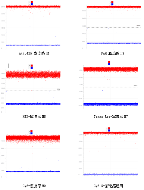 下圖應用羅氏dRCR儀同時檢測禽流感H1、H3、H5、H7、H9亞型和通用型6個病原,各檢測通道間無干擾,定量結果準確性高。