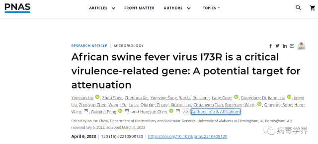 原文出處:Liu Y, Shen Z, Xie Z, Song Y, Li Y, Liang R, Gong L, Di D, Liu J, Liu J, Chen Z, Yu W, Lv L, Zhong Q, Liao X, Tian C, Wang R, Song Q, Wang H, Peng G, Chen H. African swine fever virus I73R is a critical virulence-related gene: A potential target for attenuation. Proc Natl Acad Sci U S A. 2023 Apr 11;120(15):e2210808120. doi: 10.1073/pnas.2210808120. Epub 2023 Apr 6. PMID: 37023125.