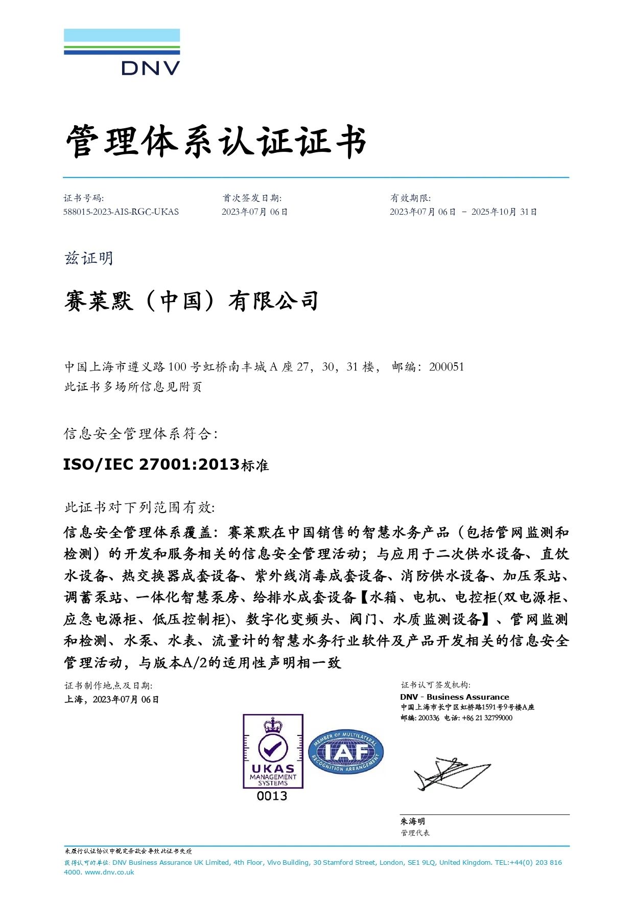 賽萊默中國本地?fù)碛袑B毜膱F隊負(fù)責(zé)網(wǎng)絡(luò)安全和數(shù)據(jù)(包括隱私)安全,確保所有數(shù)據(jù)的收集、傳輸、處理及存儲滿足國家網(wǎng)絡(luò)和數(shù)據(jù)安全相關(guān)法律法規(guī)方面的要求。賽萊默“AFO斷絲安全預(yù)警系統(tǒng)”于2023年4月21日通過等保三級測評;賽萊默于2023年7月通過ISO27001國際信息安全管理體系認(rèn)證。