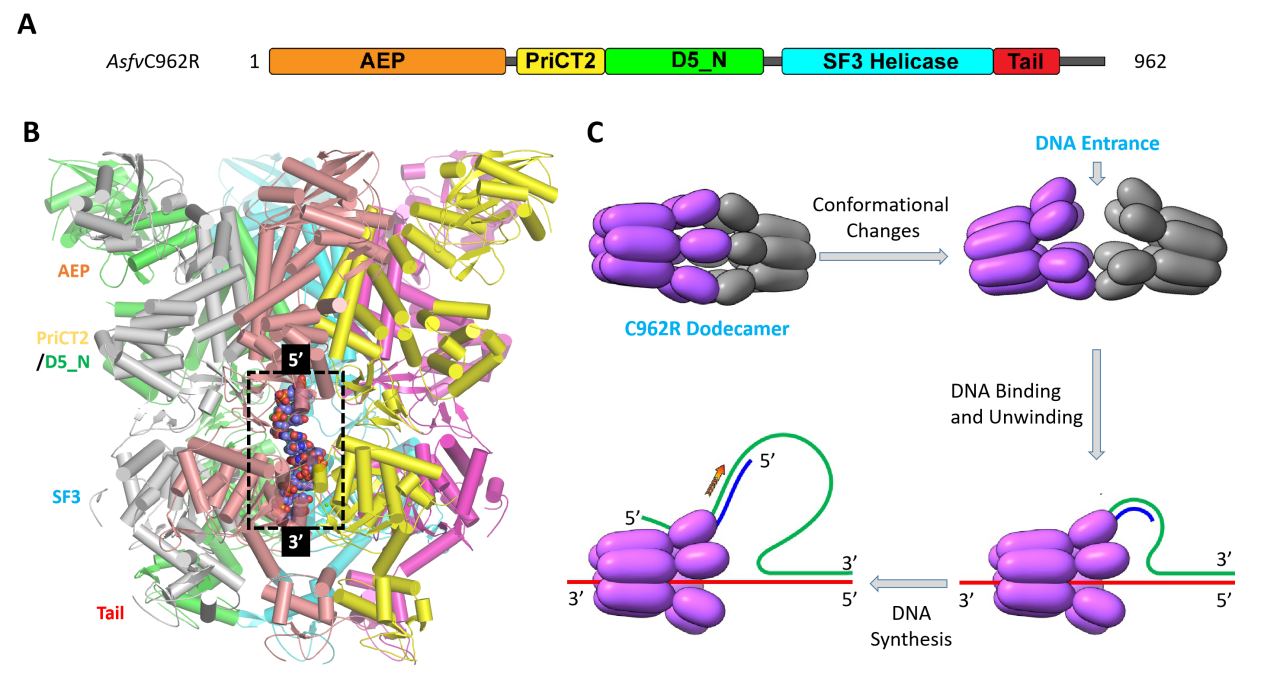 C962R是ASFV DNA復(fù)制通路中的關(guān)鍵蛋白之一,在ASFV病毒株中高度保守。盡管C962R的敲除不能完全阻斷ASFV的復(fù)制,卻可以有效延緩受感染豬的臨床癥狀的發(fā)生。論文研究顯示C962R為多結(jié)構(gòu)域蛋白,其N端的AEP結(jié)構(gòu)域負(fù)責(zé)新生DNA的從頭合成及延伸,而其SF3 Helicase結(jié)構(gòu)域則負(fù)責(zé)ATP分子的水解以及雙鏈DNA的解旋。不同于常規(guī)的SF3 Helicase家族蛋白,C962R蛋白為環(huán)狀的12聚體,由兩個(gè)6聚體head-to-head互作形成。DNA底物的入口處于6聚體的結(jié)合界面處,DNA非模版鏈的3’端可通過此入口進(jìn)入C962R結(jié)構(gòu)中心的孔道,利用SF3 Helicase結(jié)構(gòu)域水解ATP、驅(qū)動(dòng)蛋白質(zhì)構(gòu)象的變化以及DNA的解旋。盡管不參與直接的催化和解旋,C962R的PriCT2、D5_N以及Tail結(jié)構(gòu)域參與DNA的結(jié)合,其構(gòu)象變化對(duì)DNA解旋以及新生DNA的從頭合成發(fā)揮了調(diào)控作用。C962R的DNA解旋和合成機(jī)制相對(duì)保守,但是在Tail等結(jié)構(gòu)域的折疊方式上則與同源蛋白有明顯的區(qū)別。