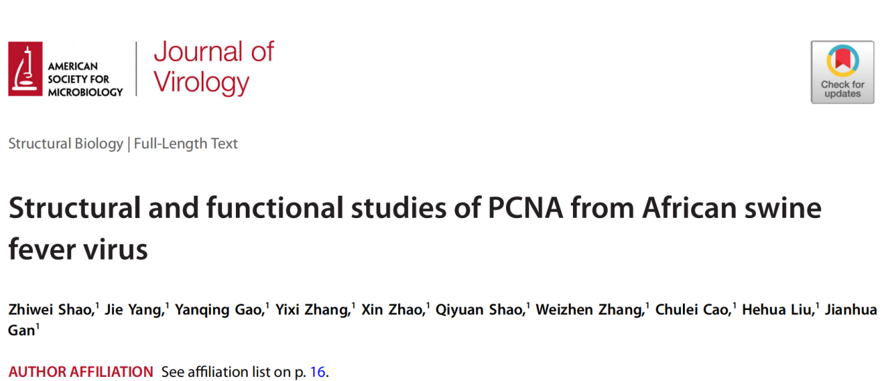 除了C962R蛋白外,ASFV的復(fù)制通路還包括了DNA聚合酶、拓?fù)洚悩?gòu)酶、dUTPase以及PCNA等蛋白。PCNA在生物體中高度保守,盡管不具有催化功能,PCNA可以通過與其他蛋白互作,提高互作蛋白的催化效率,在DNA復(fù)制、修復(fù)以及其他DNA相關(guān)的通路中發(fā)揮了重要的調(diào)控作用。AsfvPCNA與同源蛋白的序列相似性非常低,其具體的結(jié)構(gòu)和功能還沒有得到充分的驗(yàn)證。為了全面了解ASFV DNA復(fù)制的過程,甘建華課題組同樣對(duì)AsfvPCNA展開了研究,相關(guān)的結(jié)果于2023年8月3日發(fā)表在Journal of Viology雜志上,題為 “Structural and functional studies of PCNA from African swine fever virus”.