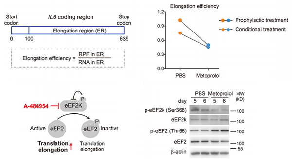 胡小玉課題組發(fā)現(xiàn),治療心血管疾病的常見藥物美托洛爾可對CAR T細(xì)胞免疫療法激發(fā)的IL-6產(chǎn)生抑制作用,該藥物通過抑制蛋白質(zhì)翻譯而不是既往被廣泛研究的mRNA轉(zhuǎn)錄水平。通過核糖體圖譜,研究團隊對CRS發(fā)生中人原代單核細(xì)胞和巨噬細(xì)胞的翻譯組進行了描繪,結(jié)合一系列的體外實驗,發(fā)現(xiàn)美托洛爾能夠通過加強真核翻譯延伸因子eEF2K-eEF2信號軸所介導(dǎo)的分子制動來抑制IL-6的翻譯延伸效率,從而減少IL-6蛋白質(zhì)的產(chǎn)生(圖)。進一步,臨床試驗的結(jié)果提示美托洛爾干預(yù)療法一方面在患者中具有良好的安全性,不損傷患者的心血管功能和CAR T細(xì)胞療法的抗腫瘤效果;另一方面能夠顯著緩解輕癥CRS,并減少重癥CRS治療中抗體類與激素類藥物的使用,也為聯(lián)合治療重癥CRS提供了早期的提示性醫(yī)學(xué)證據(jù)。