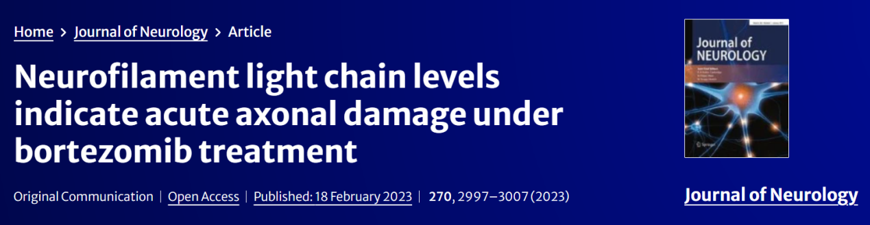 2023年2月,德國維爾茨堡大學(xué)醫(yī)學(xué)院在Journal of Neurology發(fā)表題為“Neurofilament light chain levels indicate acute axonal damage under bortezomib treatment”的研究文章,證明神經(jīng)纖維絲輕鏈(Neurofilament light chain,NfL)可以作為硼替佐米治療下急性軸突損傷的生物標(biāo)志物。