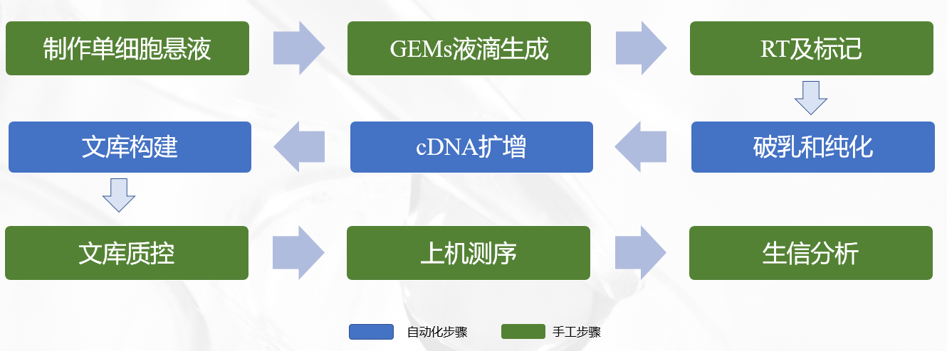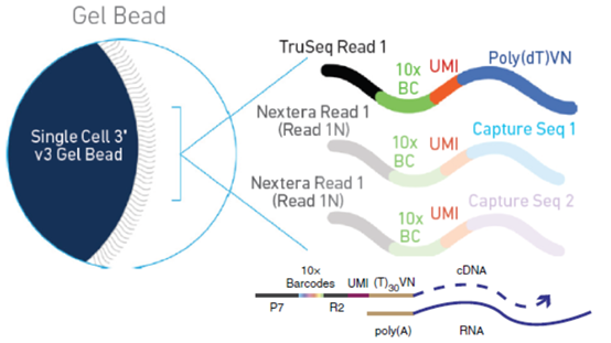 目前10X Genomics平臺是市場上最為常見的單細(xì)胞測序平臺,基于10X Genomics平臺的高通量單細(xì)胞測序技術(shù)是利用液滴法的原理,使用GemCode技術(shù),通過控制微流體的進(jìn)入,將帶barcode、UMI(Unique Molecular Index,分子標(biāo)簽)、引物及酶的凝膠珠(Gel Beads)與單細(xì)胞混合,從而實現(xiàn)大規(guī)模的單細(xì)胞分離,以及單細(xì)胞文庫構(gòu)建的技術(shù)。