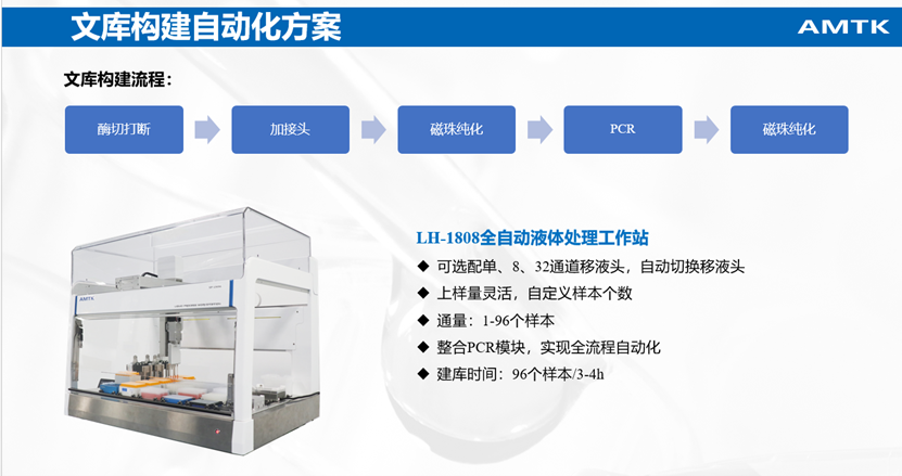 AMTK LH-1808全自動液體處理工作站整合了溫控模塊、加熱震蕩模塊、磁分離模塊,全自動PCR模塊,可輕松實現(xiàn)文庫構(gòu)建的全流程自動化。