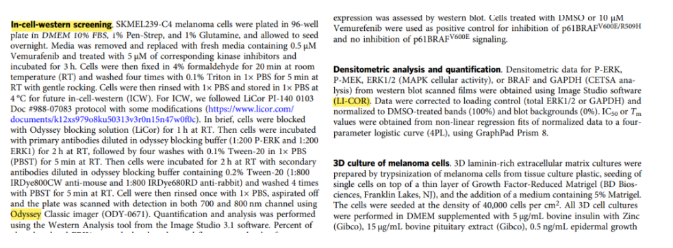 作者Xiomaris M. Cotto-Rios等利用LI-COR Odyssey 進(jìn)行Western Blot,檢測(cè)了目的蛋白(抗原/抗體)是否表達(dá)、表達(dá)的特異性、表達(dá)量的高低。文中作者使用不同熒光基團(tuán)標(biāo)記的二抗,同時(shí)檢測(cè)了磷酸化蛋白水平和該蛋白的總水平,無需進(jìn)行剝離及再孵育,大大縮短了磷酸化蛋白檢測(cè)的時(shí)間,實(shí)現(xiàn)了高效便捷的磷酸化蛋白水平和該蛋白的總水平檢測(cè)。由于藥物篩選實(shí)驗(yàn)的高通量性,本文還用到了LI-COR In cell western(無需裂解細(xì)胞、制膠、上樣、跑膠、轉(zhuǎn)膜等步驟,直接在96孔/384孔板進(jìn)行點(diǎn)Western Blot),進(jìn)行高通量的Western Blot蛋白定性定量分析。