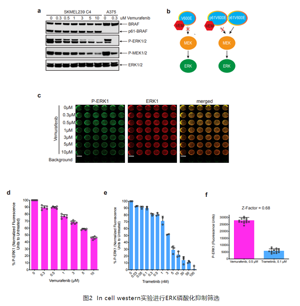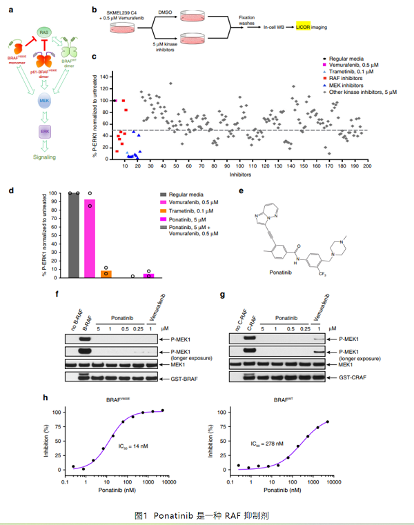 首先為了實(shí)現(xiàn)對(duì)RAF二聚體激酶抑制劑的鑒定,作者使用SKMEL239-C4黑素瘤細(xì)胞建立了基于In cell western篩選的測(cè)定方法(見下圖a、b)。在 Vemurafenib(維莫非尼,BRAF選擇性抑制劑)誘導(dǎo)的抑制BRAF的選擇壓力下,允許表達(dá)p61BRAF(p61BRAF對(duì)Vemurafenib病毒有抗藥性,可在患者的腫瘤中發(fā)現(xiàn))的細(xì)胞優(yōu)先生長(zhǎng),即這類細(xì)胞可產(chǎn)生BRAF的剪接突變體,其以不依賴于RAS的方式通過二聚體形式進(jìn)行信號(hào)通路轉(zhuǎn)導(dǎo)。對(duì)未經(jīng)藥物處理或用增加濃度的 Vemurafenib處理過3小時(shí)的SKMEL239-C4細(xì)胞,測(cè)定其細(xì)胞內(nèi)的蛋白磷酸化水平。微孔板的In cell western圖像顯示的是細(xì)胞中磷酸化ERK1(綠色)和總ERK1(紅色)的熒光抗體孵育后的表達(dá)情況及其合并圖像(圖2c)。基于磷酸化ERK (p-ERK)和總ERK熒光讀數(shù)的 In cell western ,檢測(cè)到的信號(hào)動(dòng)態(tài)范圍廣泛,并且在低濃度的 Vemurafenib下重現(xiàn)了SKMEL239-C4細(xì)胞的p-ERK 抗性。相反,Trametinib,一種FDA批準(zhǔn)的MEK抑制劑,在低nM濃度下有效地抑制ERK信號(hào)傳導(dǎo)(圖2e)。作者使用具有非抑制濃度的Vemurafenib作為陰性對(duì)照和0.1μM Trametinib陽(yáng)性對(duì)照的96孔格式,獲得0.68的Z因子(圖2f)。作者發(fā)現(xiàn) ,Ponatinib是一種有效的BRAF抑制劑,具有與其他RAF抑制劑相似的效力。