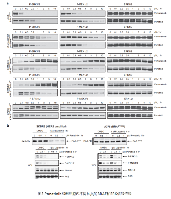 Ponatinib抑制ERK信號(hào)傳導(dǎo)而不降低SKBR3細(xì)胞中的RASWT-GST水平,而Lapatinib抑制ERK信號(hào)傳導(dǎo)并如預(yù)期的那樣顯著降低RASWT-GST水平(圖3b)。