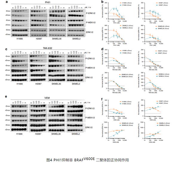 最后,評(píng)估PHI1對(duì)肺腺癌H2087和H1666細(xì)胞以及由RASMUT/BRAFWT驅(qū)動(dòng)的SKMEL-2和SKMEL-30黑素瘤細(xì)胞系的抑制作用。在非康奈非尼處理的細(xì)胞中,檢測(cè)到PHI1的低p-ERK抑制(圖5a,b)。相比之下,在康奈非尼預(yù)處理后,PHI1在H2087和H166肺癌細(xì)胞系中均表現(xiàn)出亞微摩爾p-ERK抑制,在H2087中具有更顯著的作用(圖4a,b)。綜上所述,這些結(jié)果表明PHI1對(duì)BRAF二聚體的第二位點(diǎn)具有獨(dú)特的特異性,并且在不同類型的BRAF抑制劑之間具有明顯的正協(xié)同抑制機(jī)制。
