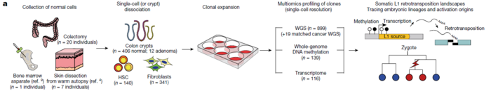 這項研究由共同第一作者Chang Hyun Nam(KAIST的研究生)和Jeonghwan Youk博士(KAIST的前研究生)領(lǐng)導(dǎo),他們對28人的皮膚(成纖維細(xì)胞)、血液、結(jié)腸上皮組織等899個單細(xì)胞進(jìn)行了全基因組序列分析。該研究揭示了正常細(xì)胞中L1跳躍基因的激活,導(dǎo)致基因組突變隨著時間的推移逐漸積累。