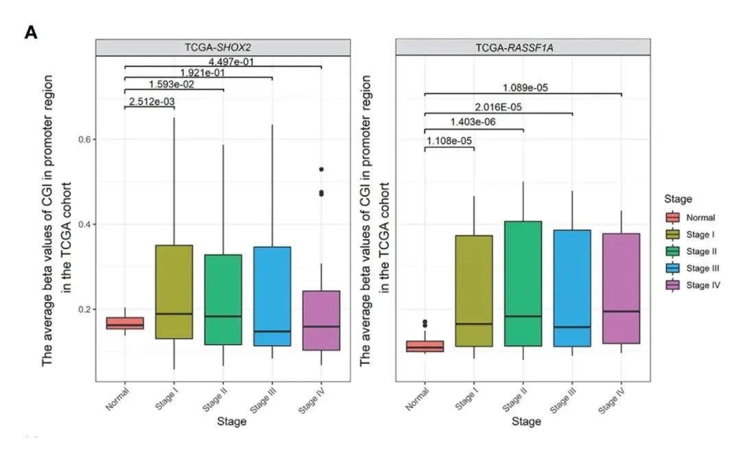 對來自南京鼓樓醫(yī)院54名早期LUAD患者和31名良性肺結(jié)節(jié)患者的樣品進(jìn)行聯(lián)合SHOX2和RASSF1A啟動子甲基化測定。結(jié)果顯示:來自LUAD患者的腫瘤樣本SHOX2啟動子甲基化檢測水平略高于RASSF1A,同時發(fā)現(xiàn)SHOX2或者RASSF1A啟動子甲基化檢測對早期LUAD敏感且特異,但單個基因甲基化檢測的診斷效率不高。聯(lián)合啟動子甲基化檢測對0期患者的診斷潛力仍不清楚。隨著疾病分期從0-II期增加,或者隨著LUAD從AIS(原位癌)進(jìn)展到MIA(微浸潤肺腺癌)再到IPA(浸潤性腺癌),SHOX2或者RASSF1A啟動子甲基化水平逐漸增加。聯(lián)合甲基化檢測呈陽性的患者腫瘤可能發(fā)生快速進(jìn)展,需要積極治療。此外,對TCGA隊列的分析表明SHOX2在第三至第四階段沒有顯著上升。這可能表明SHOX2啟動子高甲基化是早期LUAD的生物標(biāo)志物,但不是晚期LUAD的生物標(biāo)志物[3]。