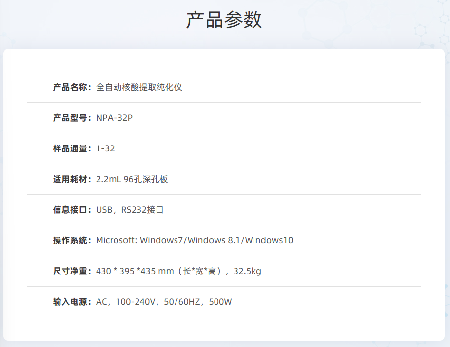 自動化、高通量:核酸提取實驗自動化,一次性可處理樣品32份,處理核酸速度為單個手工提取的4-5倍。